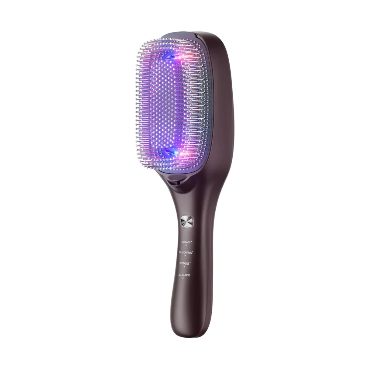 Profesjonalna szczotka trychologiczna wykorzystuje zaawansowane technologie, takie jak światło LED, terapia laserowa LLLT, impulsy EMS oraz masaż soniczny, aby aktywnie stymulować mieszki włosowe i poprawiać mikrokrążenie skóry głowy. Regularne stosowanie wspiera naturalne procesy regeneracyjne, pomaga ograniczyć wypadanie włosów, poprawia ich gęstość oraz wzmacnia je już od nasady. Dodatkowo technologia jonizacji wygładza strukturę włosa, redukuje elektryzowanie i przywraca zdrowy, naturalny połysk.